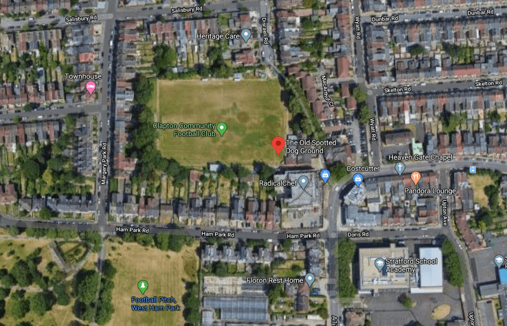 Questo è Forest Gate, quartiere di Londra Est, e la struttura che ospita la squadra locale stenta a rientrare nella definizione di stadio. The Old Spotted Dog Ground è semplicemente un campo di calcio. La minuscola tribuna con posti a sedere e la gradinata sorretta da impalcature metalliche si guardano dai lati opposti di un campo in erba a tratti scosceso. Intorno, un misto irregolare di paesaggio urbano e naturanasconde quasi del tutto il campo alla vista dall’esterno. Qualche bambino fortunato può passare i pomeriggi in giardino godendosi lo spettacolo con le mani aggrappate alla rete che divide il suo backyard dal campo di calcio.